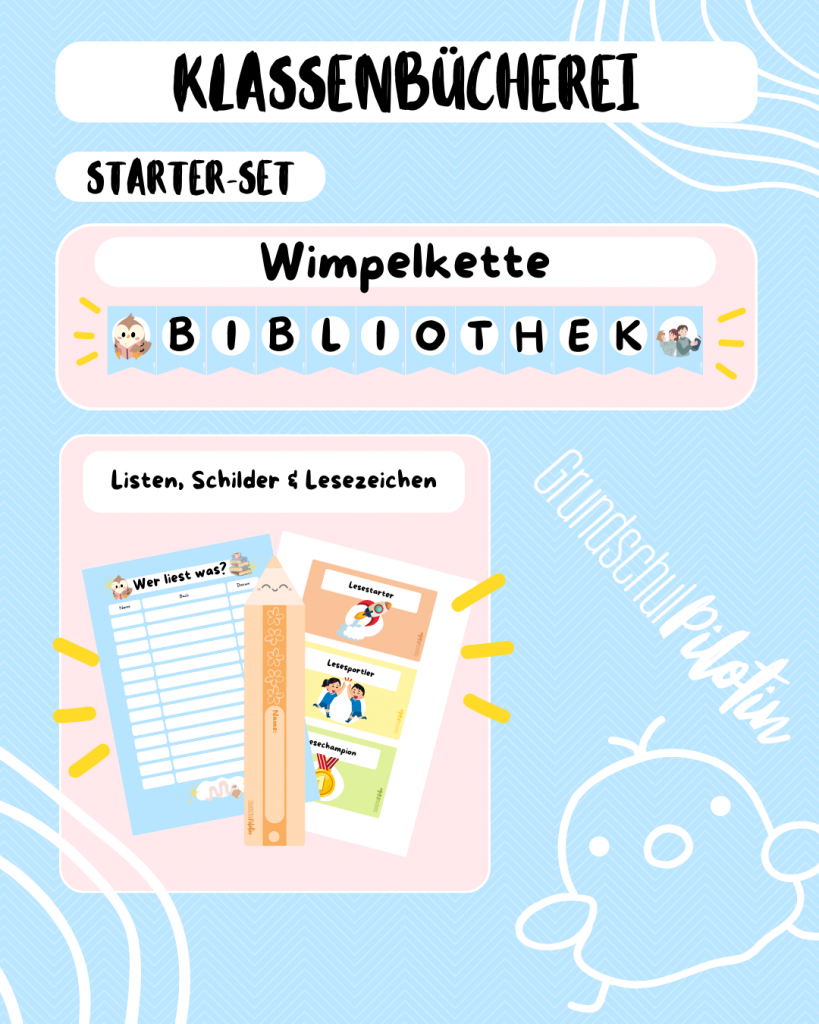 Ich drucke das Material aus, laminiere alles und schneide es zurecht. Die Schilder bringe ich mit einfachem Tesafilm an den Bücherständern an – fertig. Die Wimpelkette sorgt für einen einladenden, gemütlichen Look und macht die Bücherei zu einem Ort, den die Kinder gerne aufsuchen. Gelesen wird bei uns übrigens meist morgens vor Unterrichtsbeginn im offenen Anfang – eine ruhige, schöne Zeit. Ich freue mich riesig, dass dieses Herzensprojekt nun seinen Weg in andere Klassenzimmer findet ❤️
